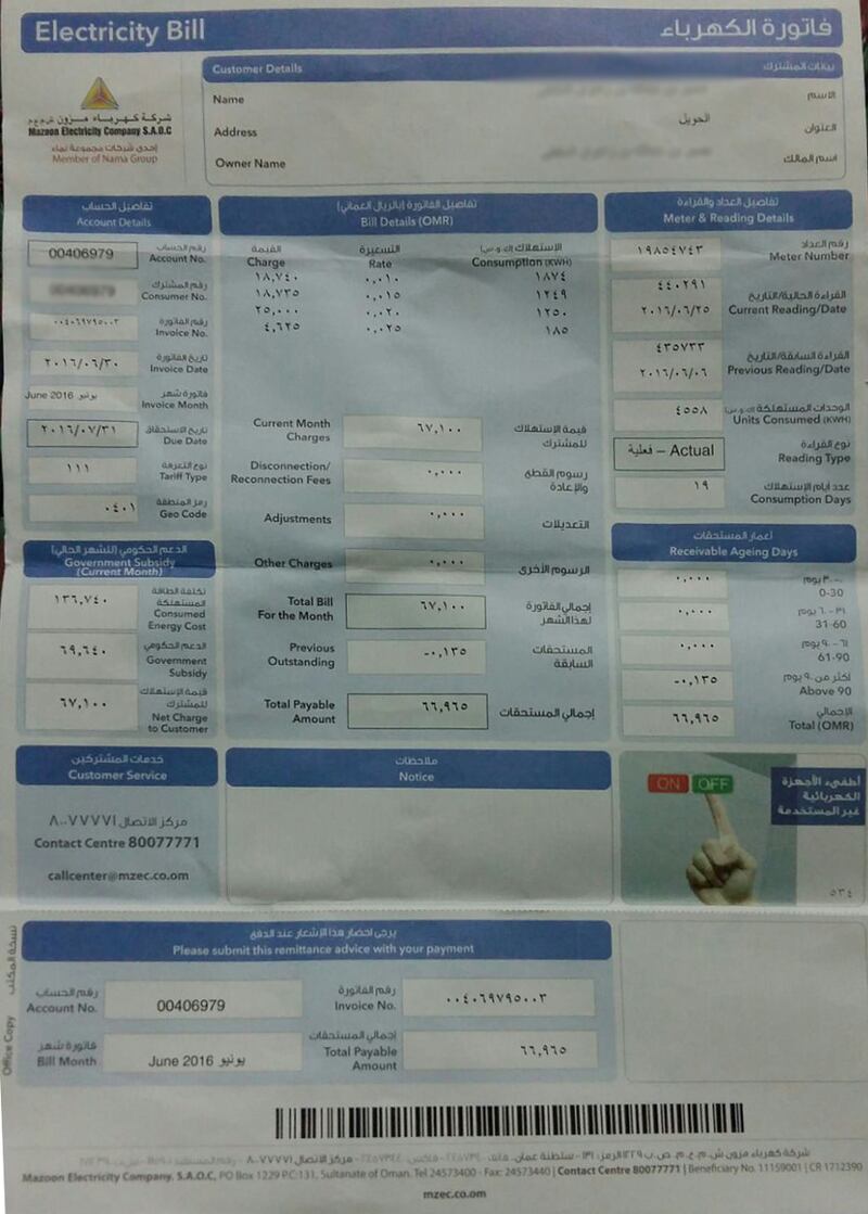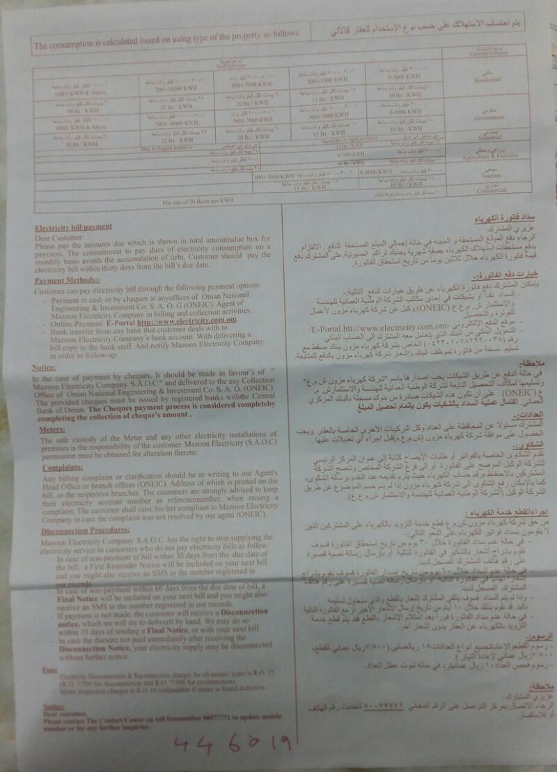 وأوضح بدر الصلتي أحد المواطنين المتضررين في وادي بني هني بولاية الرستاق أن المتبع في النظام هو احتساب التسعيرة بـ10 بيسات إذا كان الاستهلاك أقل من 3 آلاف وحدة في الشهر، وتحسب 15 بيسة إذا كان الاستهلاك من 3 إلى 5 آلاف وهكذا ، ولكن ما حدث في فاتورة هذا الشهر أنه تم حساب التسعيرة لمدة 19 يوما فقط وليس لشهر كامل، وتم تقسيم وحدات الاستهلاك من 10 إلى 25 بيسة وهي لم تكمل الـ3 آلاف كما هو في النظام المتعارف عليه، ويتضح ذلك في الفاتورة أن تسعيرة الـ10 بيسات كانت 1874 وحدة ، وتم الانتقال إلى حساب الـ15 بيسة والـ20 والـ25 وهي لم تصل إلى 3 آلاف “.