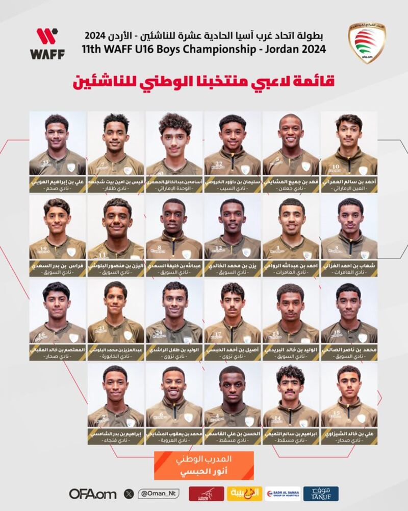 أعلن الاتحاد العماني لكرة القدم، صباح اليوم، قائمة لاعبي منتخب الناشئين، للمشاركة في بطولة اتحاد غرب آسيا الحادية عشرة لمنتخبات الناشئين والتي ستقام في الأردن خلال الفترة 2-11 سبتمبر المقبل.