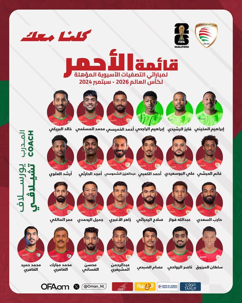 وبحسب القائمة التي أعلنها تشيلافي لم يحدث فيها أي تغيير عن القائمة السابقة التي شاركت في المعسكر التدريبي للأحمر العماني الذي أقيم في إسبانيا في الفترة من 1 إلى 23 يوليو الماضي، باستثاء استبعاد الثنائي، جواد العزي ومصعب المعمري، إضافة إلى الحارس أحمد بن فرج الرواحي الذي يعاني من إصابة الرباط الصليبي التي تعرض لها في المعسكر التدريبي.