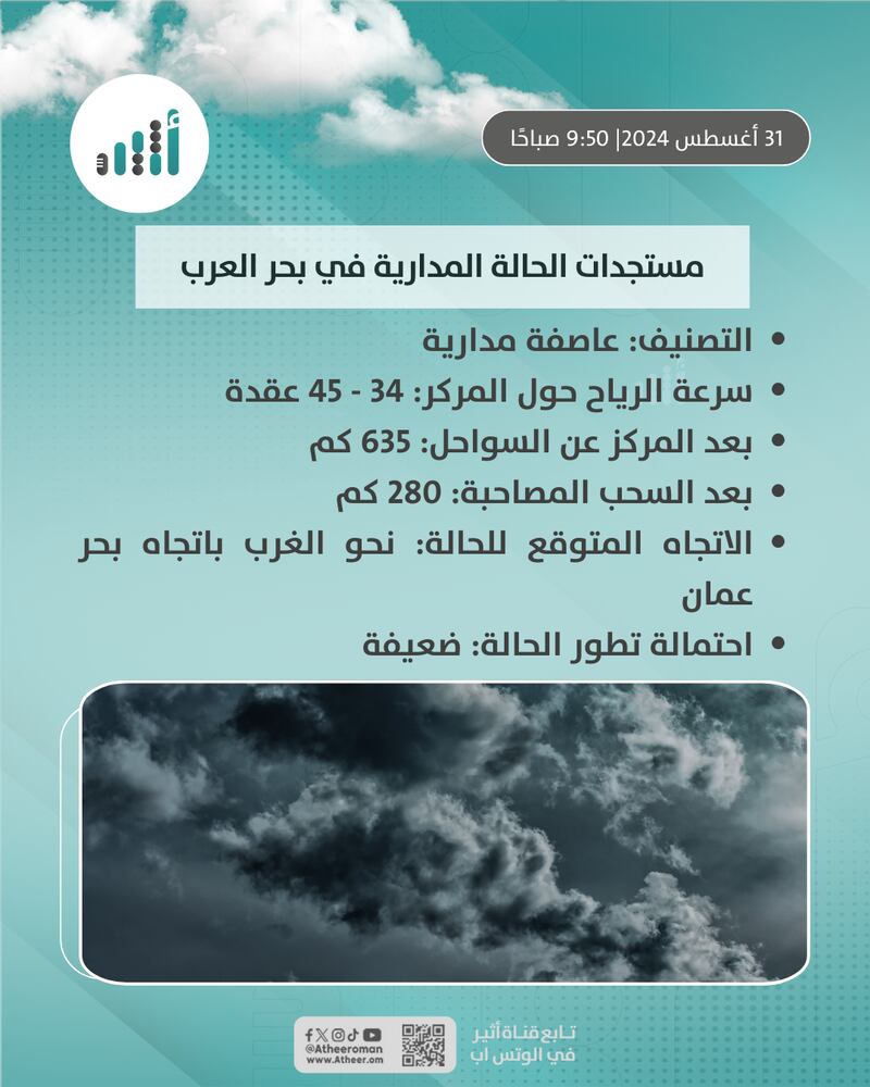 نشرت الأرصاد العمانية في تمام الساعة 9:43 صباحًا مستجدات الحالة المدارية في بحر العرب “أسنا” جاء فيها الآتي: