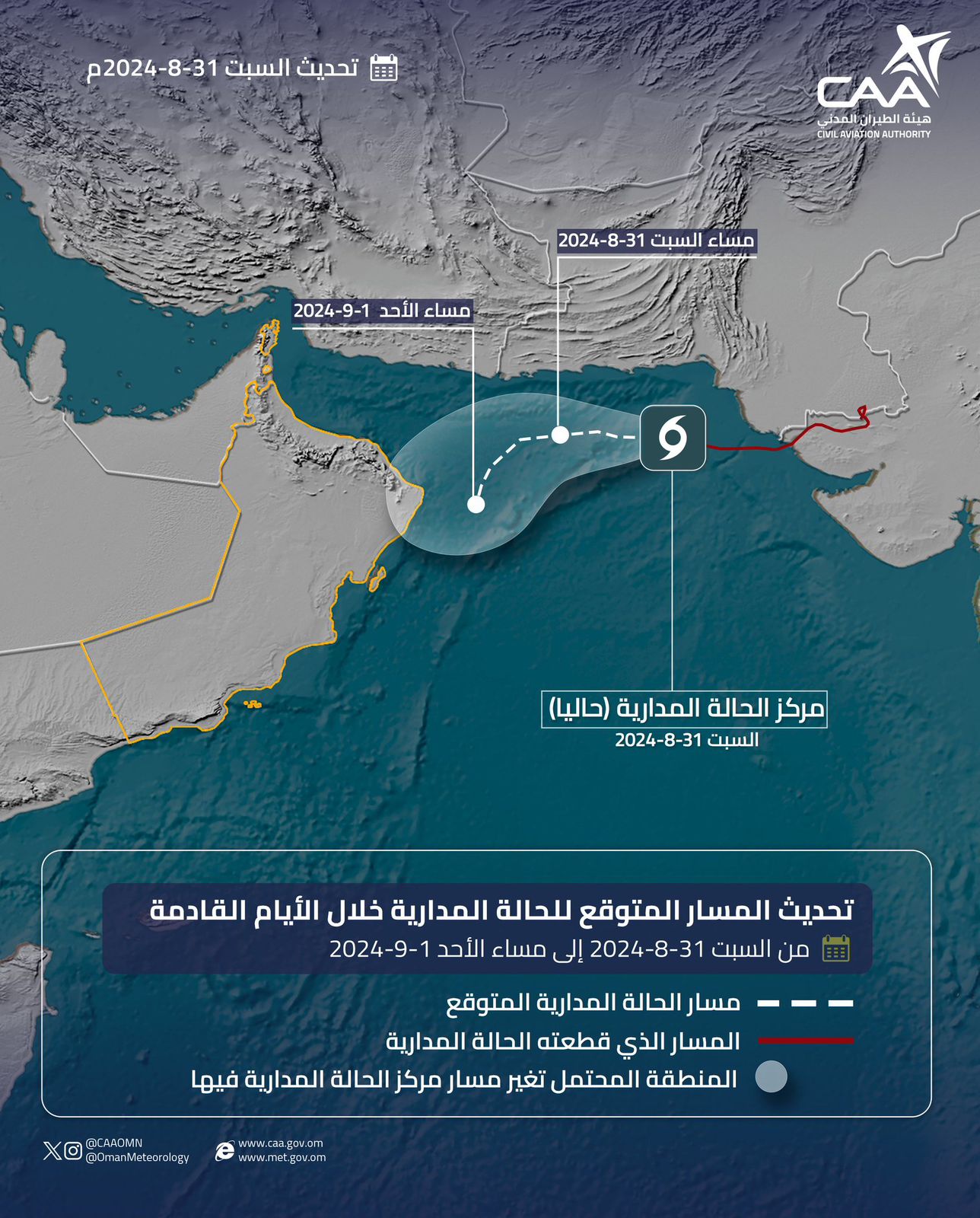 وما تزال التوقعات تشير إلى استمرار تدفق السحب الماطرة بشكل متفرق على محافظات جنوب الشرقية وشمال الشرقية ومسقط وأجزاء من الوسطى ابتداءً من مساء يوم الأحد ١ سبتمبر ٢٠٢٤ وتستمر حتى يوم الاثنين ٢ سبتمبر ٢٠٢٤ مع فرص هطول أمطار متفاوتة الغزارة تتراوح ما بين ١٠-٣٠ ملم قد تؤدي إلى جريان بعض الشعاب والأودية على أن تتلاشى تأثيرات الحالة الجوية تدريجياً من صباح يوم الثلاثاء ٣ سبتمبر ٢٠٢٤.