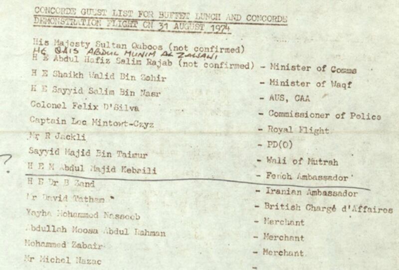 وفي ملف منشور ضمن وثائق الأرشيف الرقمي للخليج العربي، ويحمل رقم (FCO 8/2225)، ويغطي الفترة من الأول من يناير إلى الحادي والثلاثين من ديسمبر 1974م، ويتعلق بالمساعدات التنموية من المملكة المتحدة لسلطنة عُمان، هناك وثيقة تتناول زيارة طائرة من طراز كونكورد إلى مطار السيب الدولي في الحادي والثلاثين من أغسطس 1974م، وبها قائمة المدعوين لزيارة الطائرة ومن بينهم السيد ماجد بن تيمور، والسيد حمد بن حمود، والسيد سالم بن ناصر البوسعيدي، والشيخ وليد بن زاهر الهنائي، وقيس بن عبد المنعم الزواوي، وعبد الحافظ بن سالم بن رجب، ومحمد بن الزبير، ويحيى بن محمد نصيب، وعبد الله بن موسى عبد الرحمن، وسفراء فرنسا وإيران لدى سلطنة عمان، والقائم بالأعمال البريطاني، وعدد آخر من الشخصيات السياسية والدبلوماسية والاقتصادية.