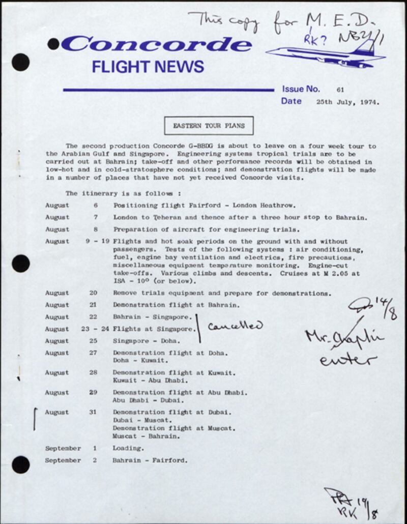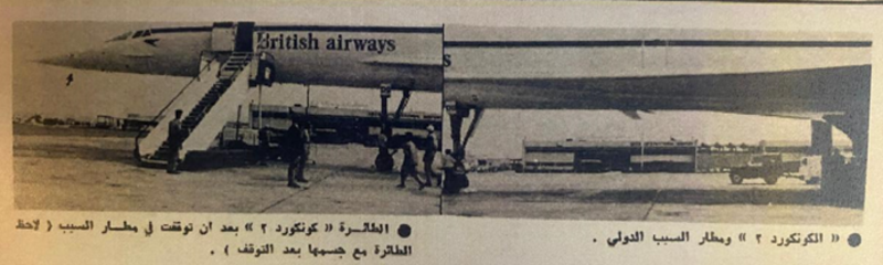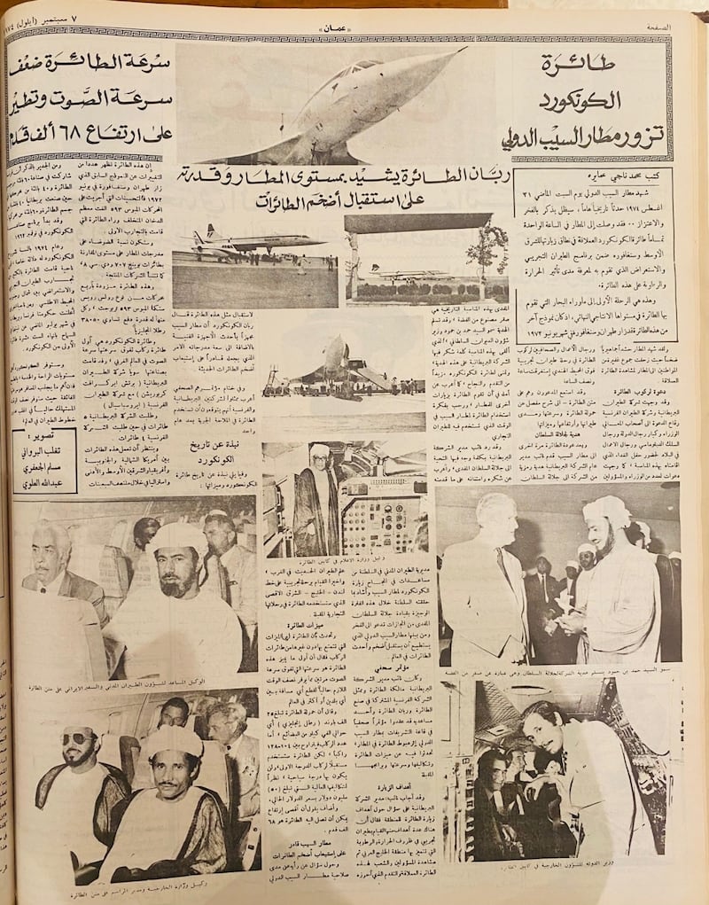 كان يوم الحادي والثلاثين من أغسطس عام 1974م يومًا مشهودًا في مطار السيب الدولي (مسقط حاليًا)؛ ففي تمام الساعة الواحدة تمامًا وصلت طائرة (الكونكورد) العملاقة في نطاق زيارتها للشرق الأوسط وسنغافورة ضمن برنامج الطيران التجريبي والاستعراض الذي تقوم به لمعرفة مدى تأثير الحرارة والرطوبة عليها، وهي الرحلة الأولى لما وراء البحار التي تقوم بها الطائرة في مستواها الإنتاجي النهائي، إذ كان نموذج آخر من هذه الطائرة قد زار طهران وسنغافورة في شهر يوليو 1972م.
