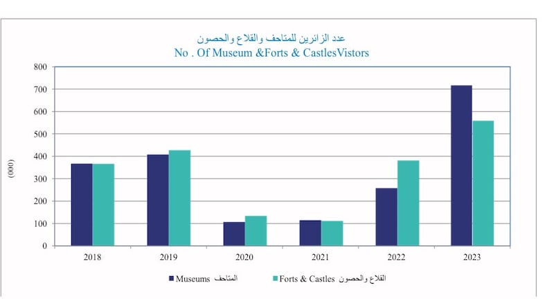 ووفق الكتاب الإحصائي السنوي للمركز الوطني للإحصاء والمعلومات فقد بلغ عدد الزائرين للمتاحف 716 ألف زائر، بزيادة كبيرة عن الرقم في عام2022م، حيث بلغ حينها 258 ألف زائر.