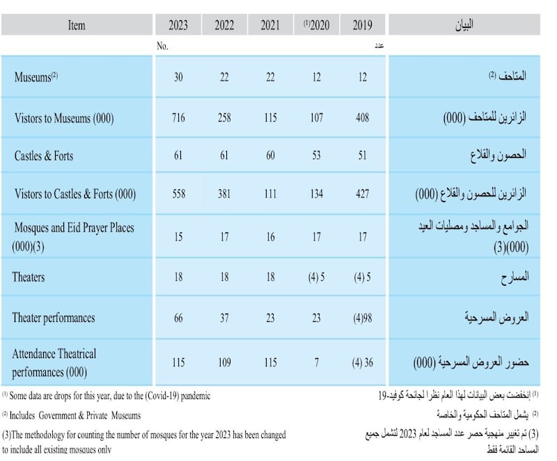 وشهدت المسارح زيادة بـ 25 عرضًا مسرحيًا عن الرقم المسجل في عام 2022م. كما زاد عدد حضور العروض المسرحية بـ6 آلاف شخص وبإجمالي 116 ألفًا.
