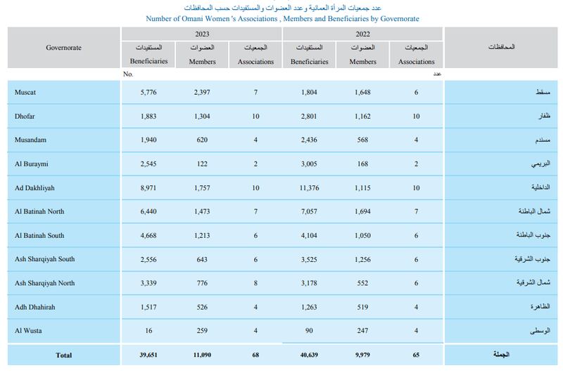 أشار تحديث جديد في البيانات إلى أن عدد جمعيات المرأة العمانية بمختلف محافظات سلطنة عمان بلغ حتى عام 2023م ( 68) جمعية.