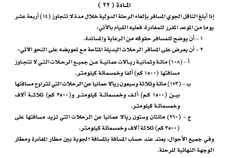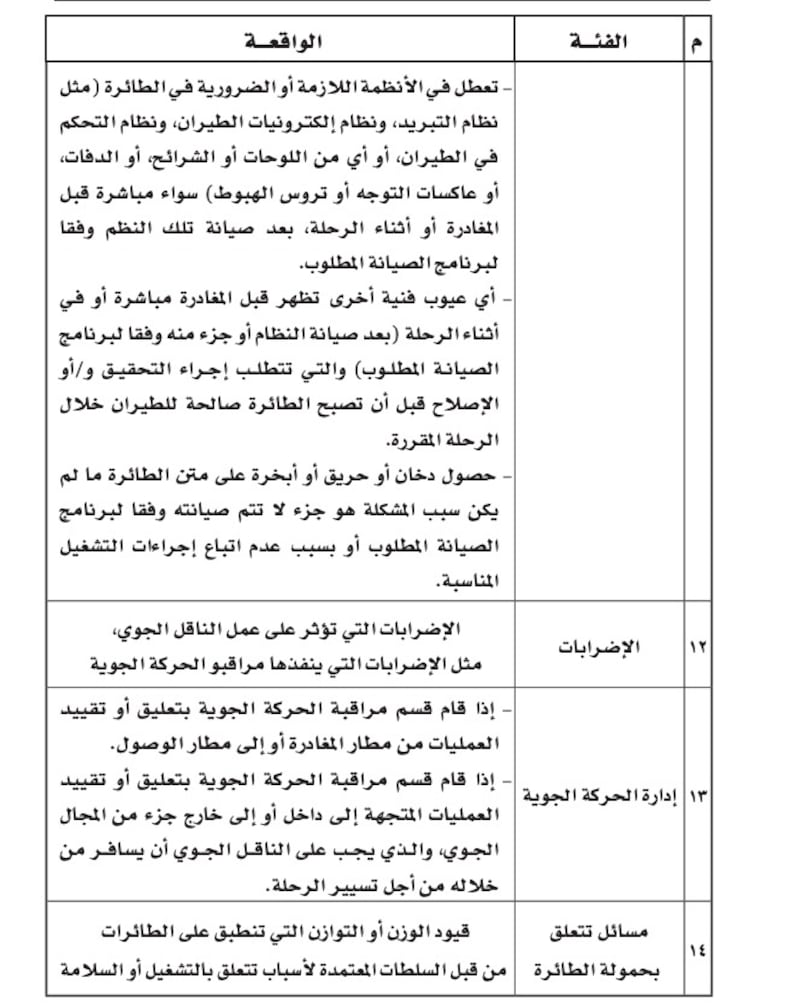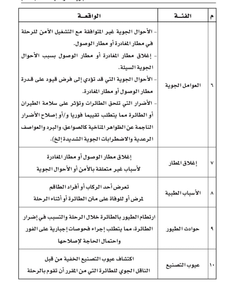 -يعرض الناقل الجوي الرحلات البديلة المتاحة، مع تعويض المسافر بحسب مسافة الرحلات، وتتراوح ما بين 108 ريالات إلى 260 ريالًا.