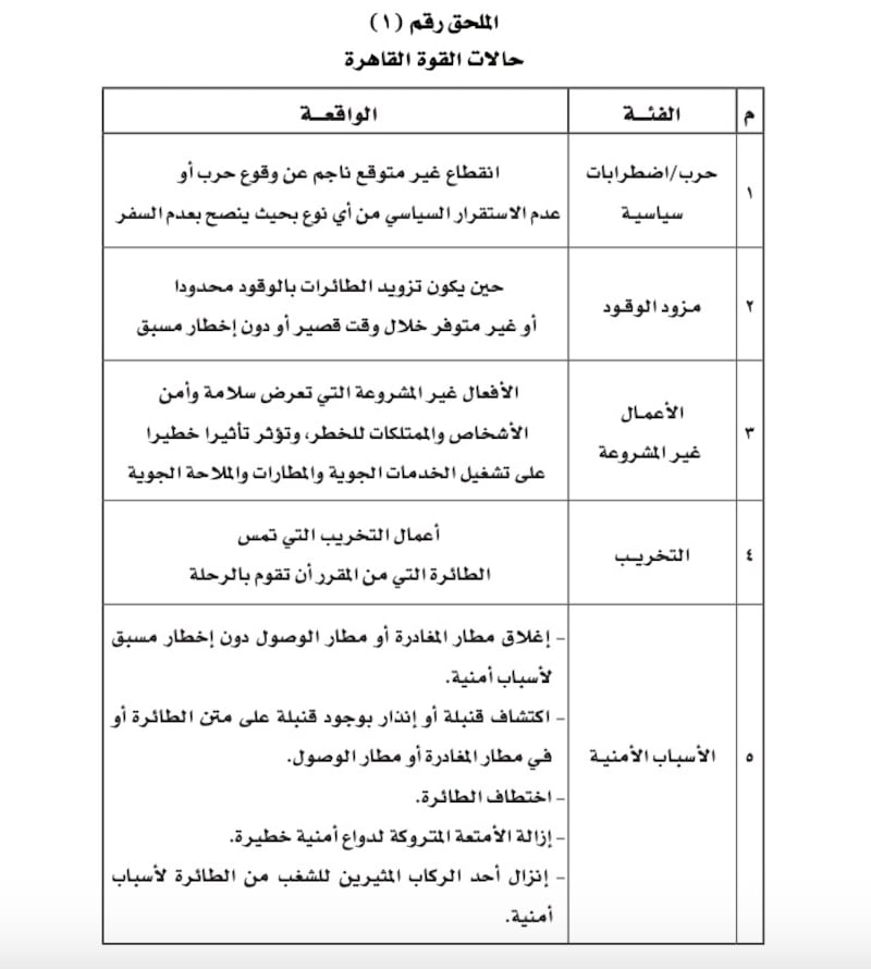ولا يجوز للناقل الجوي تأخير أو إلغاء الرحلات عن موعدها الا في حالات القوة القاهرة، وفي حال إلغاء رحلة الرحلات الدولية فعليه القيام بالآتي:
