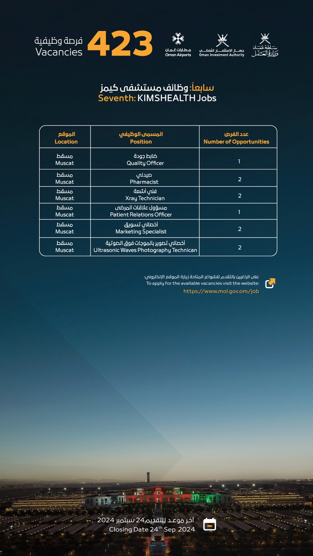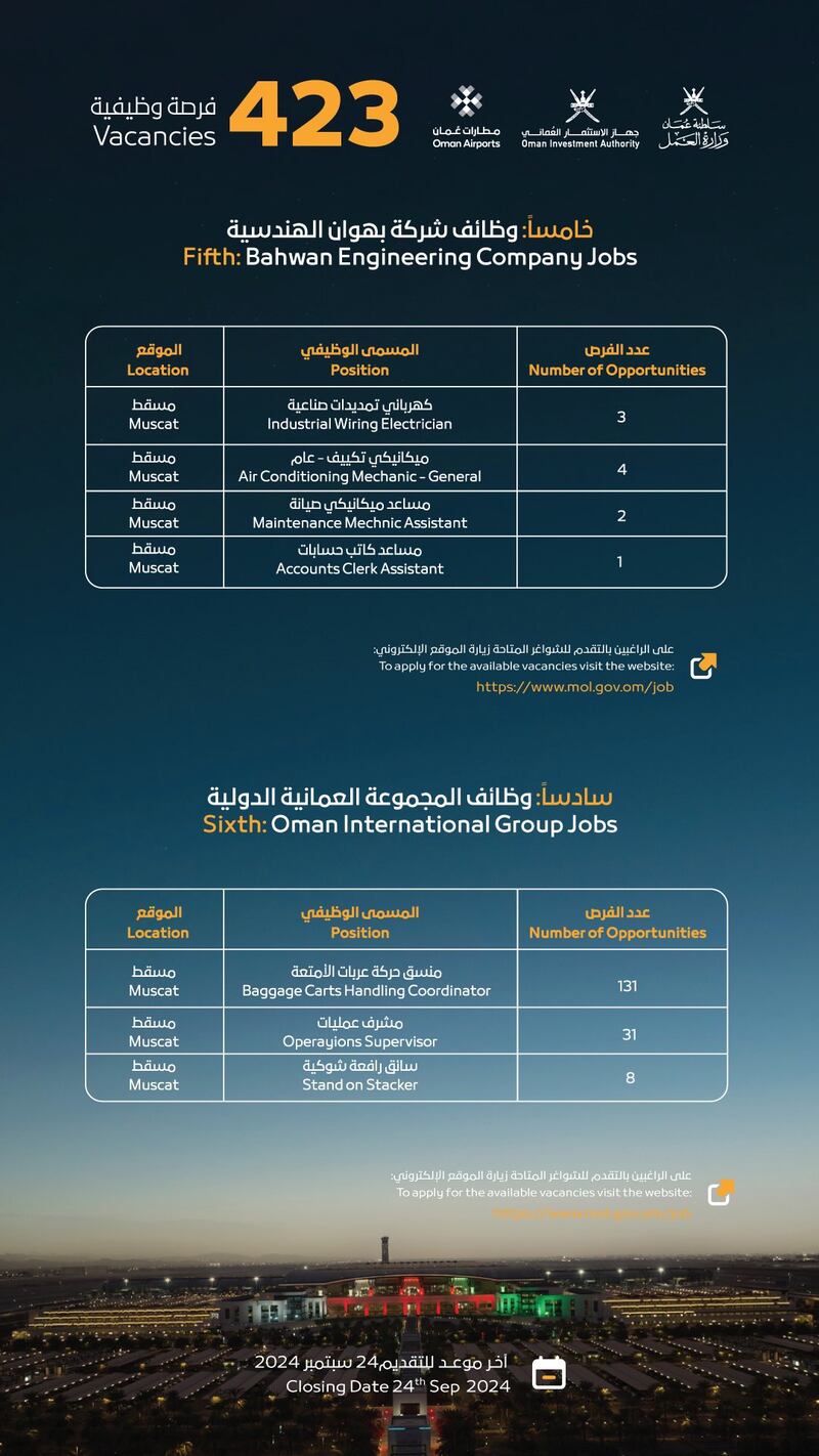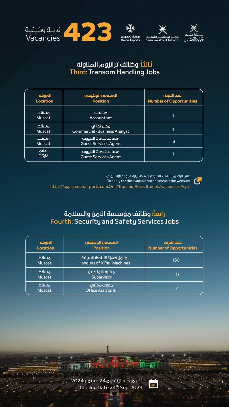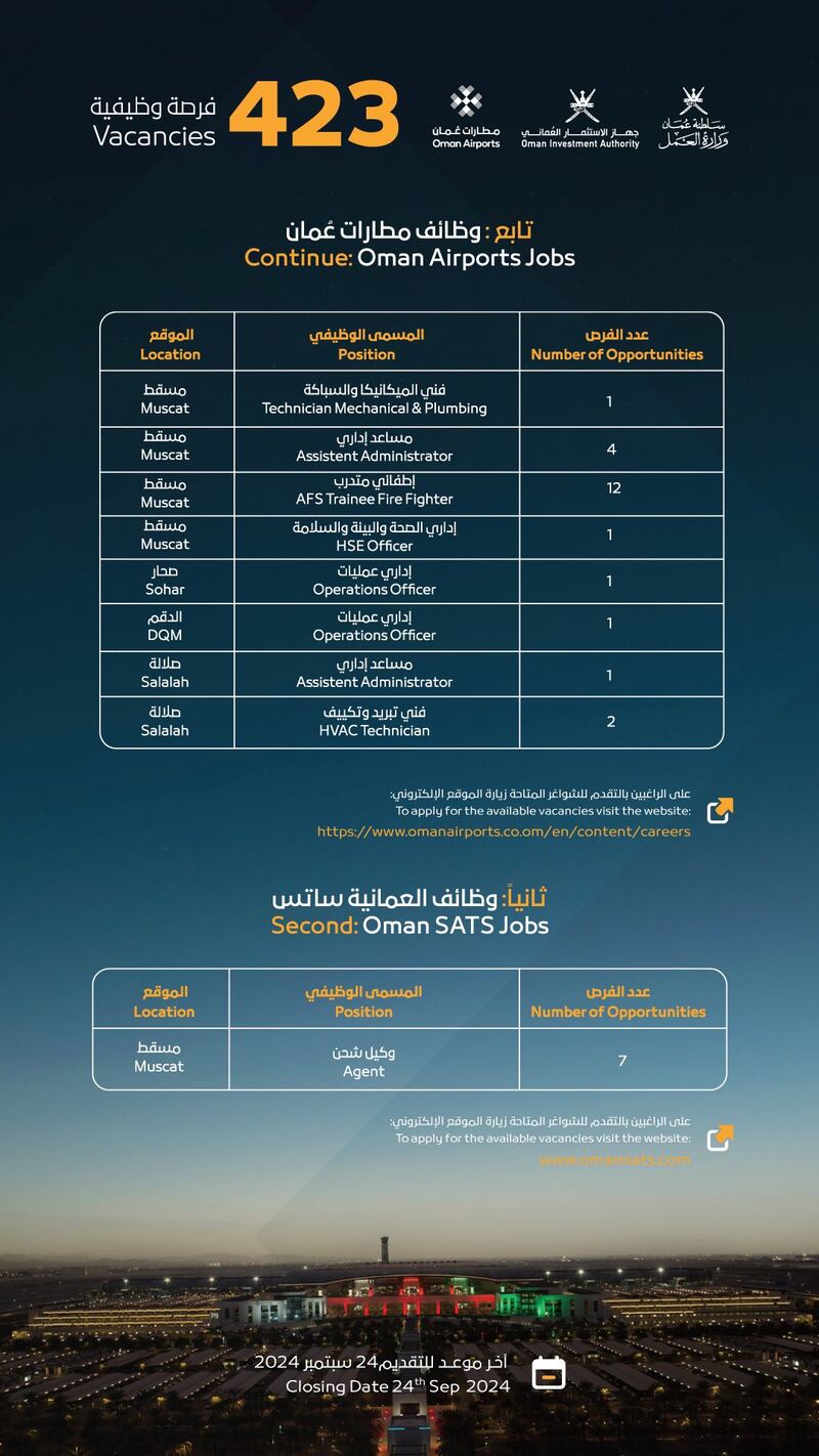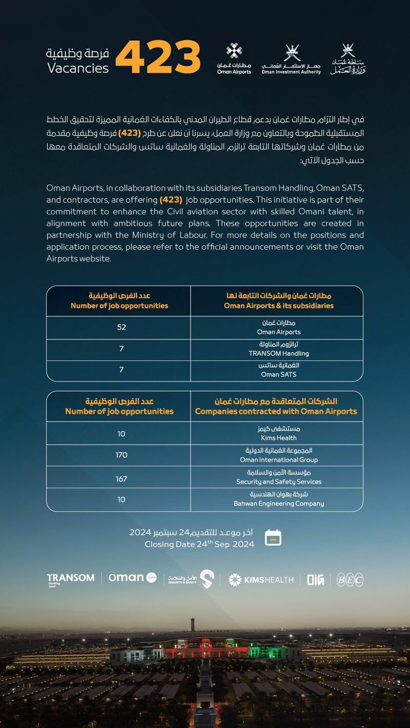 أعلنت ”مطارات عُمان“ بالتعاون مع وزارة العمل عن توفير 423 فرصة وظيفية للعمانيين في مختلف التخصصات الإدارية والفنية بمطارات سلطنة عُمان والشركات التابعة لها، وفقًا لما نشرته وكالة الأنباء العمانية.