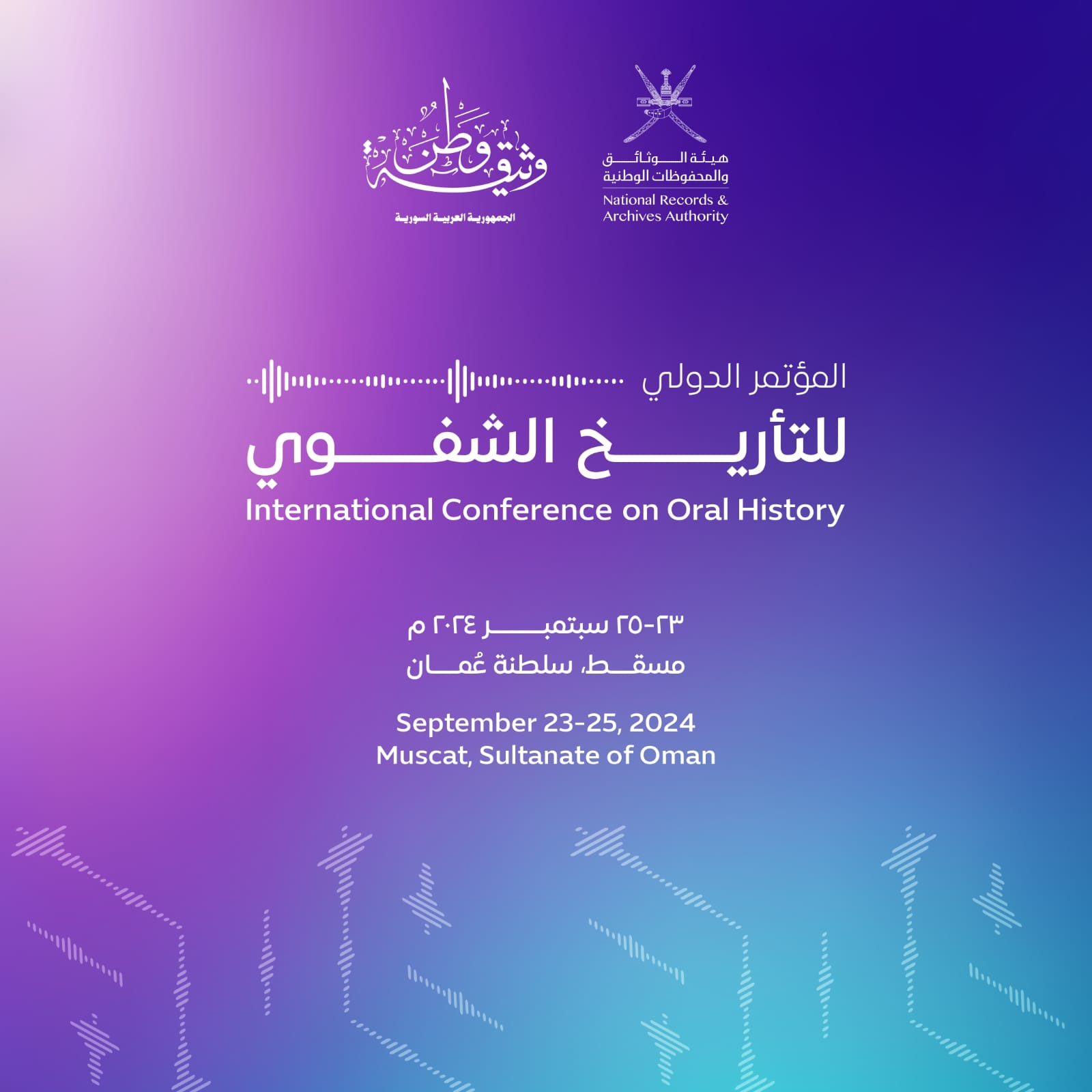 تبدأ الاثنين المقبل أعمال المؤتمر الدولي للتأريخ الشفوي ”المفهوم والتجربة عربيًّا“ الذي تنظمه هيئة الوثائق والمحفوظات الوطنية بالتعاون مع مؤسسة وثيقة وطن بالجمهورية العربية السورية خلال ٢٣-٢٥ من سبتمبر الجاري بفندق جراند ميلينيوم - الخوير وبمشاركة وحضور مؤسسات وهيئات ومراكز وثائقية عربية وعالمية، وذلك تحت رعاية معالي السيد سعود بن هلال بن حمد البوسعيدي محافظ مسقط.