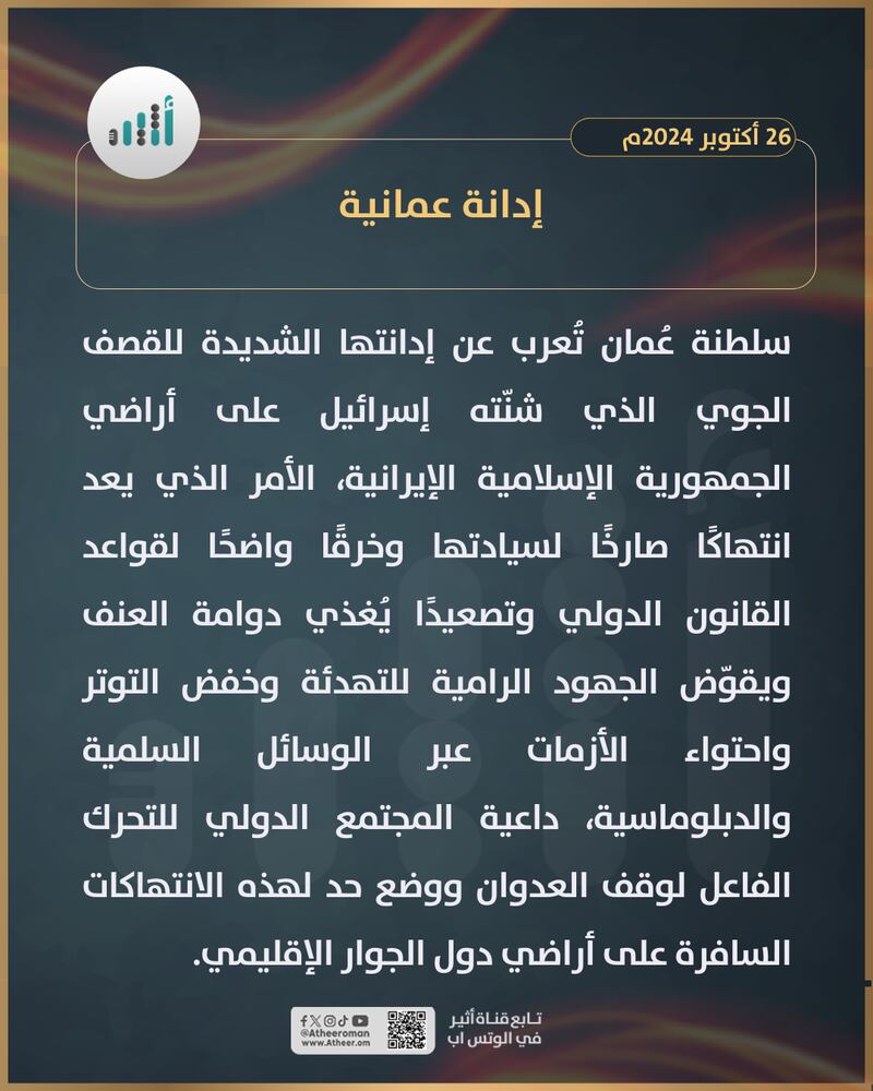 جدير بالذكر أن وزارة الخارجية أصدرت بيانًا أعربت فيه عن إدانتها الشديدة للقصف الجوي الذي شنّته إسرائيل على أراضي الجمهورية الإسلامية الإيرانية.