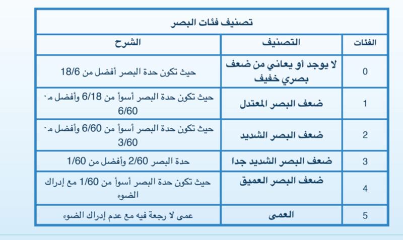 - الإعاقة البصرية التي يكون فيها معدل البصر 2/60 فأقل في كلتا العينين مع وجود المساعدات أو المعينات الطبية وبعد إجراء تصحيح البصر أيا كان نوعه إن لزم الأمر.