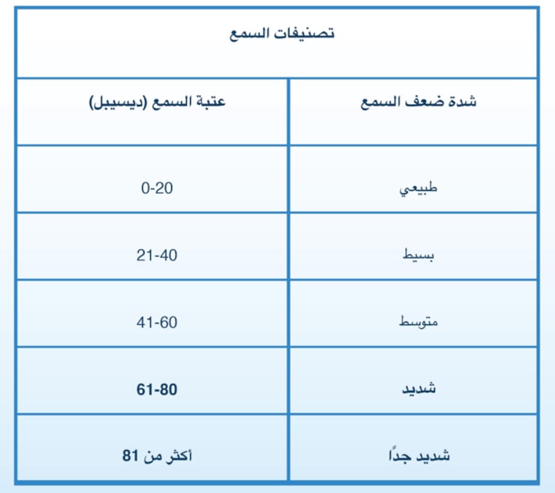 - الإعاقة السمعية التي تكون عتبة السمع فيها 61 ديسيبل فأعلى في كلتا الأذنين مع وجود المساعدات أو المعينات الطبية وبعد إجراء تصحيح السمع أيا كان نوعه إن لزم الأمر.