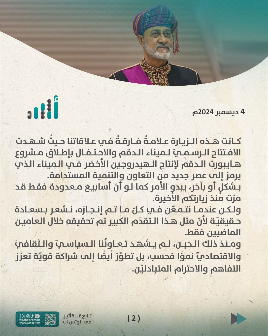 أكد البيان المشترك عزم البلدين الصديقين لتعزيز التعاون الثُّنائي في القطاعات الاقتصادية الرئيسة تشمل الأنشطة البحريّة والتعاون بين الموانئ، والتحوّل في مجال الطاقة والهيدروجين الأخضر، وإيجاد فرص اقتصاديّة مستدامة وازدهار مشترك.