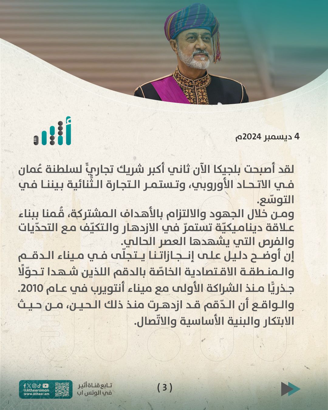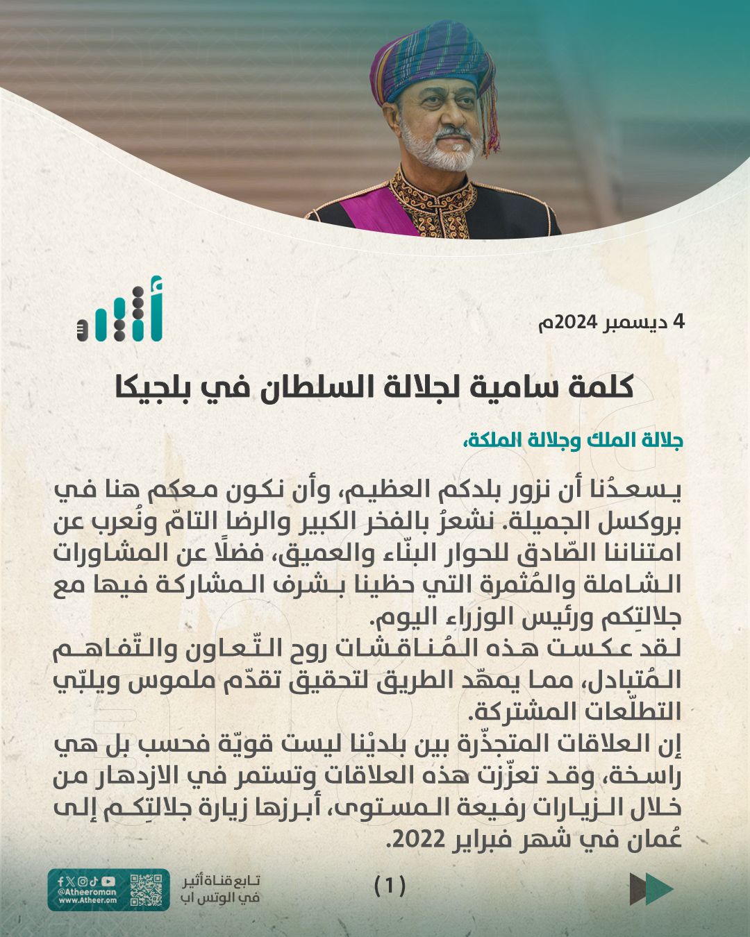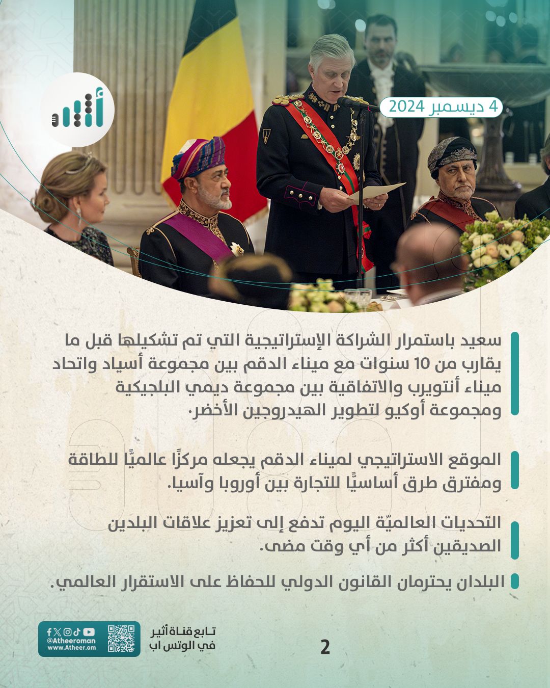 عقد جلالة السُّلطان المعظم -حفظهُ اللهُ ورعاهُ- وجلالةُ ملك البلجيكيين لقاءً ثُنائيًّا، أكّدا خلاله الرغبة المشتركة لتعزيز علاقات التعاون والشراكة بما يسهم في تنشيط اقتصاد البلدين وفتح مجالات جديدة للاستثمار وتبادل المصالح.