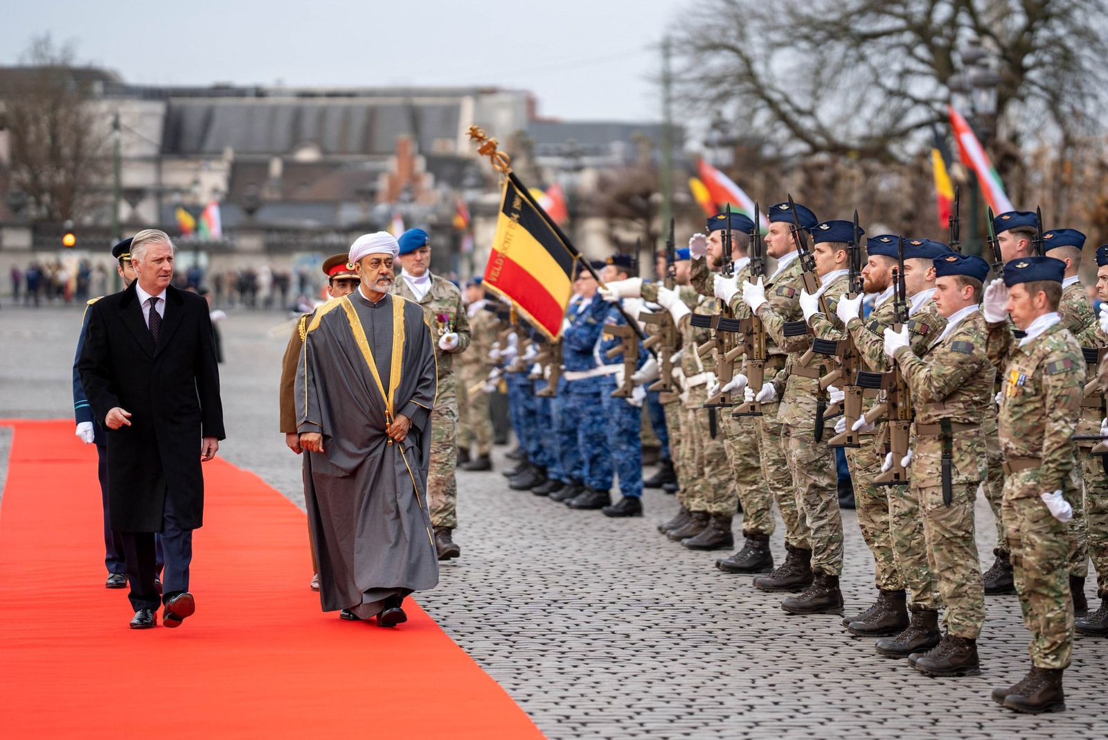 أُجريت لجلالةِ السُّلطان المعظم مراسمُ استقبال رسميّة بالقصر الملكي في بروكسل بمناسبة زيارة ”دولةٍ“ يقوم بها جلالتُه لمملكة بلجيكا، فلدى توجّه الموكب المقلِّ لجلالتِه إلى ساحة القصر الملكي أحاطت الموكبَ كوكبةٌ من الدرّاجات النارية، وقُبيل وصوله إلى الساحة الرئيسة للقصر الملكي، حفّت بالموكب مجموعةٌ من الخيالة، واصطف على جانبي المسار عددٌ من فرسان الخيالة الملكية البلجيكية.