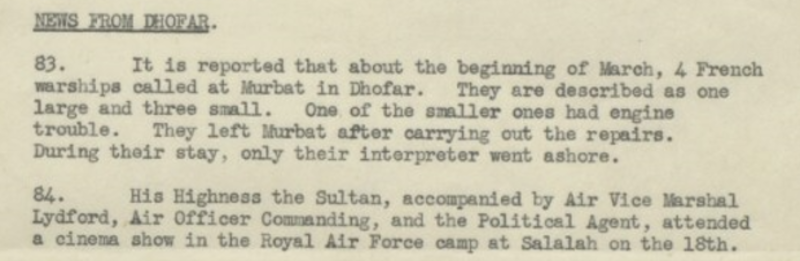 وفي تقرير مسقط الاستخباراتي الصادر عن القنصلية البريطانية في مسقط، والذي يغطي الفترة من 16 إلى 31 مارس 1947م، هناك فقرة تشير إلى أن السلطان سعيد بن تيمور حضر في الثامن عشر من مارس عرضًا سينمائيًا في معسكر سلاح الجو في صلالة، وذلك برفقة الوكيل السياسي البريطاني وعدد من ضباط القاعدة.