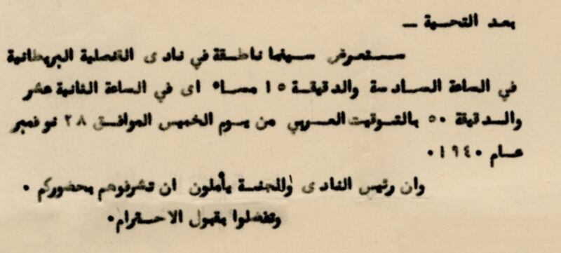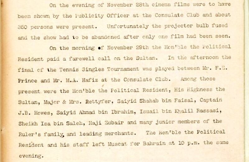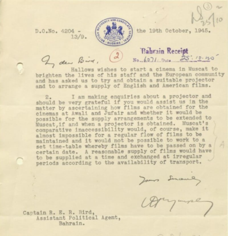 وفي رسالة مرسلة من قبل الكابتن بيرد الوكيل البريطاني في البحرين بتاريخ 19 أكتوبر 1945م هناك إشارة إلى رغبة في توفير الأدوات المتعلقة بالعرض السينمائي في مسقط لأفراد المجتمع الأوروبي هناك.