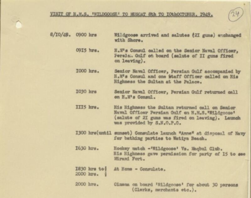وفي “ملف ١/٩ II زيارات السفن الملكية البريطانية إلى مسقط“، تحت رقم الاستدعاء: IOR/R/15/6/299، والذي يتضمن مراسلات وأوراق أخرى تتعلق بزيارات سفن البحرية البريطانية إلى مسقط، وأثناء زيارة السفينة الملكية البريطانية (وايلد جوس) إلى مسقط خلال الفترة من 8-10 أكتوبر 1949، أقيم عرض سينمائي على متن السفينة حضره حوالي (30) من الشخصيات البارزة.