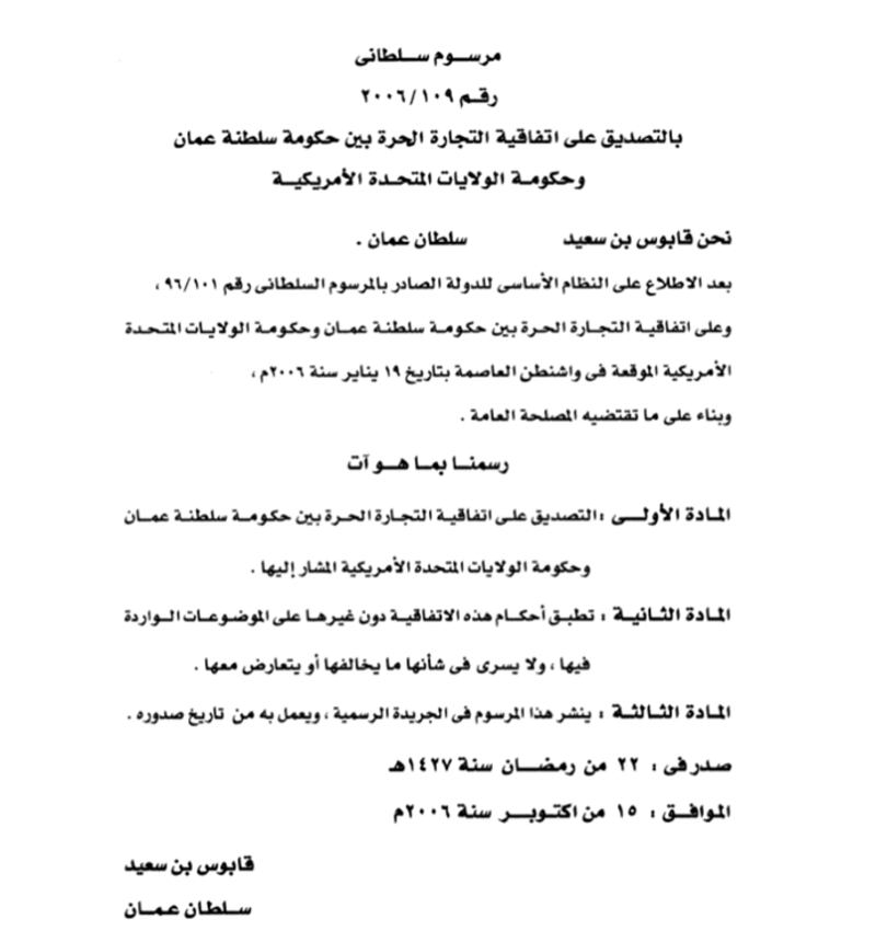 دخلت اتفاقيّة التجارة الحرّة الموقّعة بين سلطنة عمان والولايات المتحدة في واشطن بتاريخ 19 يناير 2006، والتي تم التصديق عليها وفق المرسوم السلطاني رقم (109/2006) بتاريخ 15 أكتوبر 2006، حيّز التنفيذ في الأول من يناير 2009، وذلك بعد جولات من المفاوضات والمراجعات والإجراءات من قبل الجانبين، لتصبح سلطنة عمان بذلك خامس دولة عربية تبرم مثل هذه الاتفاقية مع واشنطن بعد الأردن، والبحرين، والمغرب، ومصر.