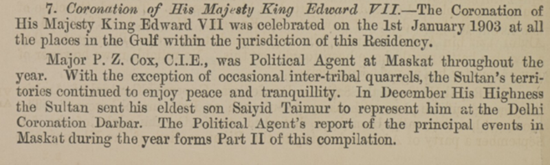 في الأول من يناير عام 1903م تلقى السلطان فيصل بن تركي دعوة من الحكومة البريطانية لحضور حفل التتويج في مدينة دلهي، ولم يشأ السلطان الغياب عن سلطنته لفترة طويلة يتطلبها حضوره الاحتفال فأرسل السلطان ابنه تيمور ممثلًا عنه.
