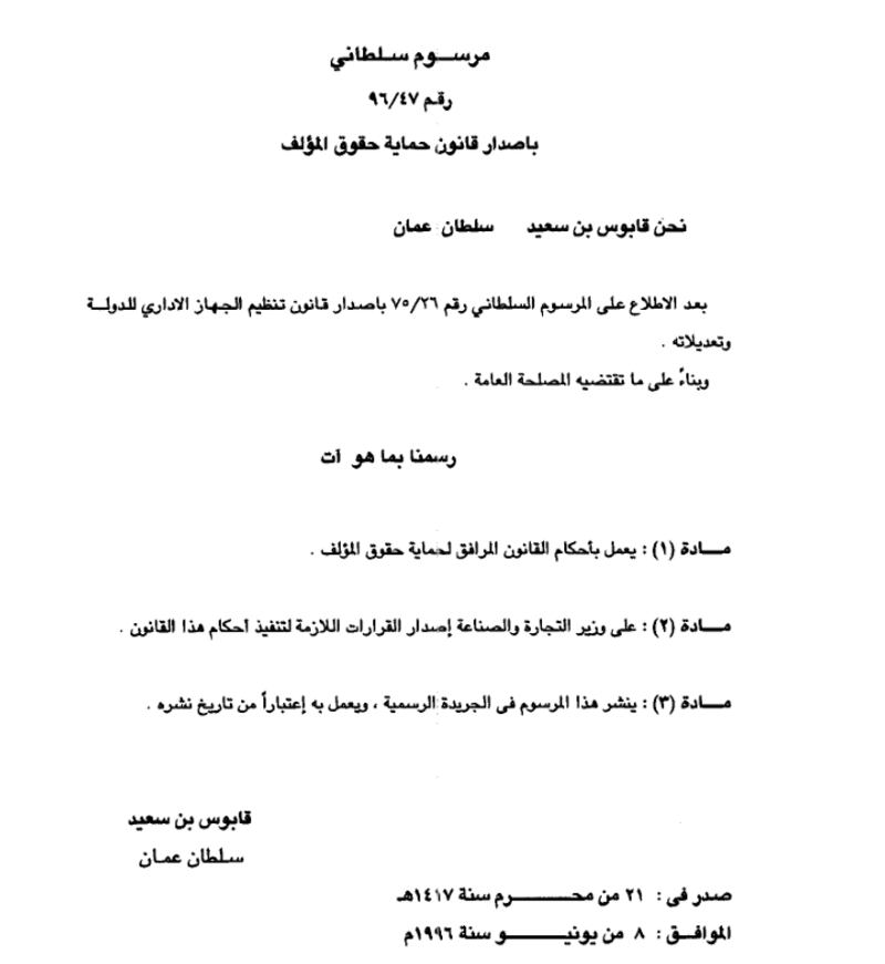 في الأول من يناير 1999م بدأت سلطنة عمان تطبيق قانون حماية الملكية الفكرية الصادر بالمرسوم السلطاني (47/1996م) الصادر في 8 يونيو 1996، والذي تم استبداله بقانون حقوق المؤلف والحقوق المجاورة الصادر بالمرسوم السلطاني رقم ٣٧ / ٢٠٠٠ ، الذي تم استبداله كذلك بإصدار قانون حقوق المؤلف والحقوق المجاورة وفق المرسوم السلطاني رقم ٦٥ / ٢٠٠٨.