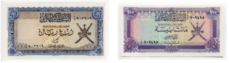 أصدر البنك المركزي العماني في الأول من يناير 1985م الورقة النقدية فئة مئتي بيسة، التي حلّت محل فئة 250 بيسة (ربع ريال).