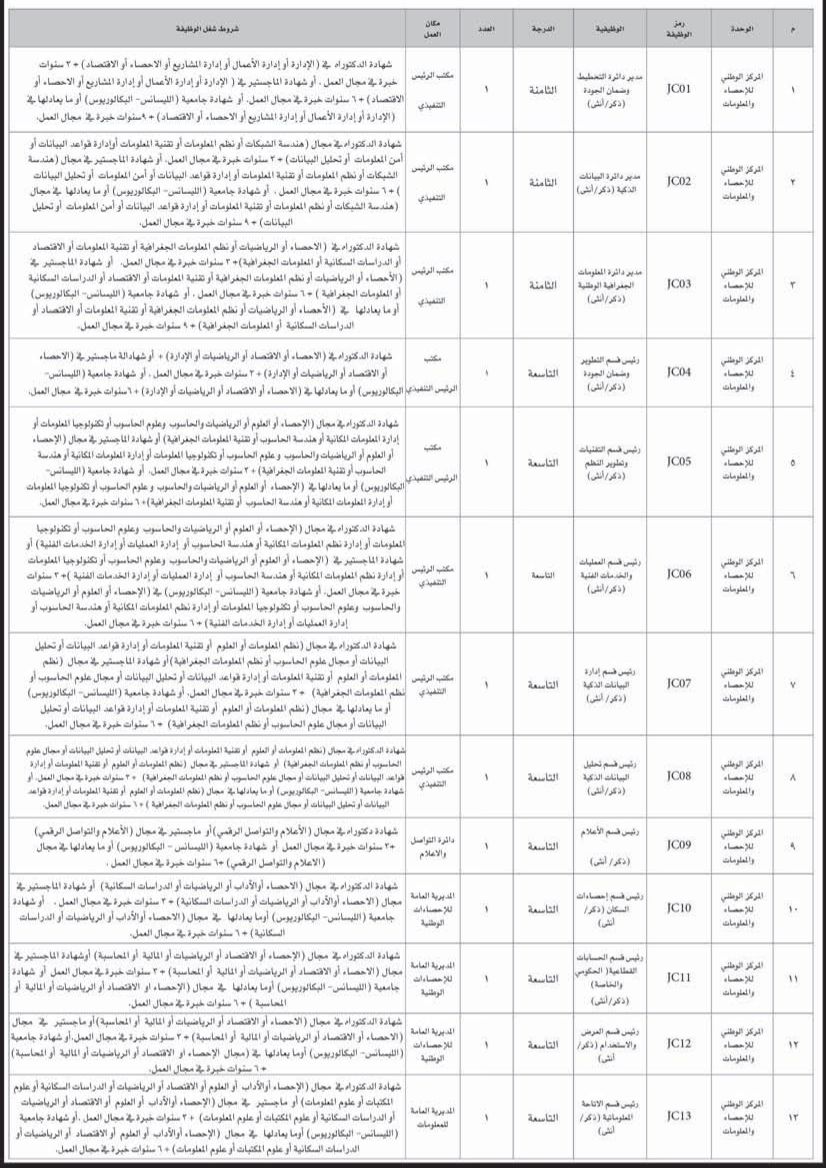 أعلن المركز الوطني للإحصاء والمعلومات بالتنسيق مع وزارة العمل عن توفر 13 شاغرًا وظيفيًا فيه.