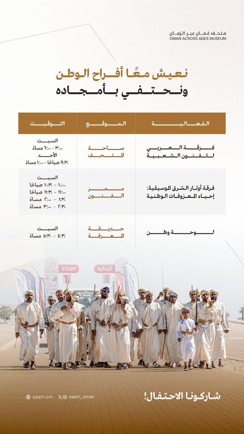 ووفقًا للإعلان الذي نشره متحف عمان عبر الزمان، فإن الفعاليات ستكون في ساحة المتحف لفرقة العربي للفنون الشعبية وفي ممر الفنون لفرقة أوتار الشرق الموسيقية: إحياء المعزوفات الوطنية، ولوحة وطن في حديقة المعرفة.