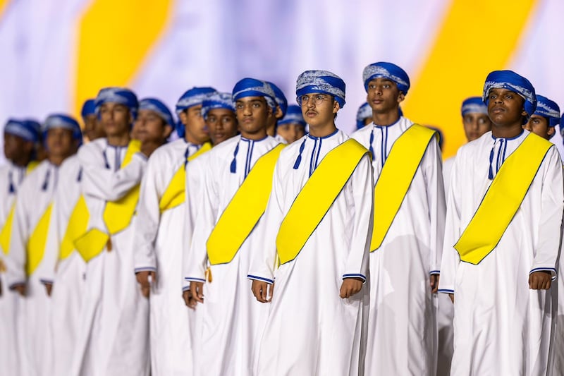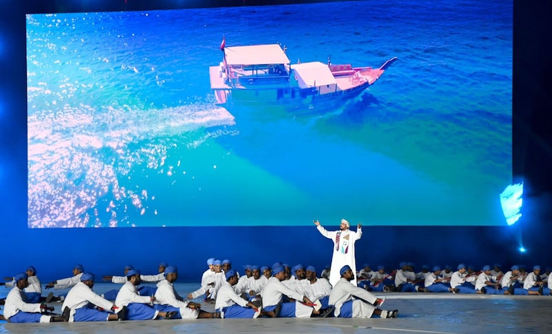 ثمّ اللوحةُ الخامسةُ “عُمان عبر الزّمان”، بمشاركة مجموعة من الطلبة والأهالي من مختلف المحافظات، وأظهرت الموروث التقليديَّ العُمانيَّ والفنون الشعبيّة عبّر فيها أبناء هذا الوطن عن المحبّة الصادقة والولاء العميق لعُمان وسُلطانها المفدّى، وجسّدت حرص العُمانيين على ممارسة فنونهم وعاداتهم جيلًا بعد جيل.
