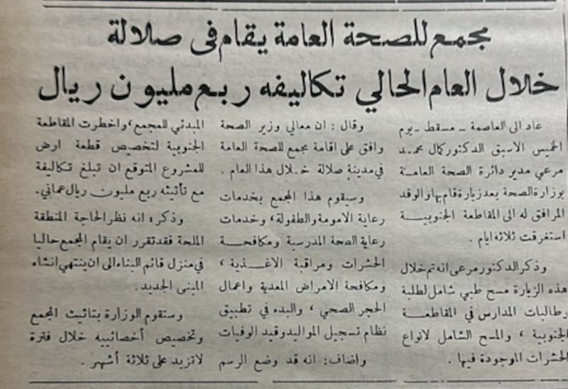 - مجمع للصحة العامة يقام في صلالة خلال العام الحالي تكاليفه ربع مليون ريال، دار جريدة عمان للصحافة والنشر، 9 فبراير 1974مـ.