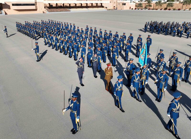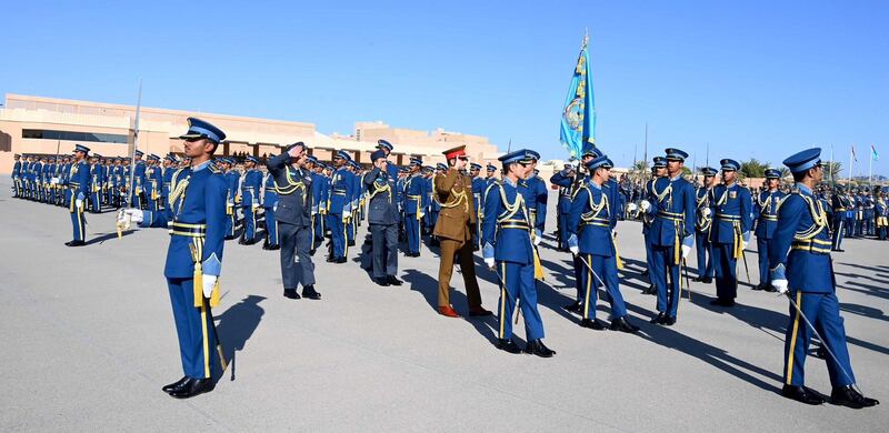 وقد بدأت مراسم حفل التخريج بالتحية العسكرية لصاحب السمو السيد وزير الثقافة والرياضة والشباب راعي المناسبة لدى وصوله ميدان الاحتفال، وعزفت فرقة موسيقى سلاح الجو السلطاني العُماني السلام السلطاني، ثم قام سموه بتفتيش الصف الأمامي من طابور الخريجين، عقب ذلك قدّم طابور الخريجين استعراضًا بالمشاة العسكرية تتقدمهم راية أكاديمية السلطان قابوس الجوية مرورًا من أمام المنصة الرئيسية بمصاحبة المعزوفات الموسيقية العسكرية، ثم تقدم الطابور بهيئة الاستعراض إلى الأمام.