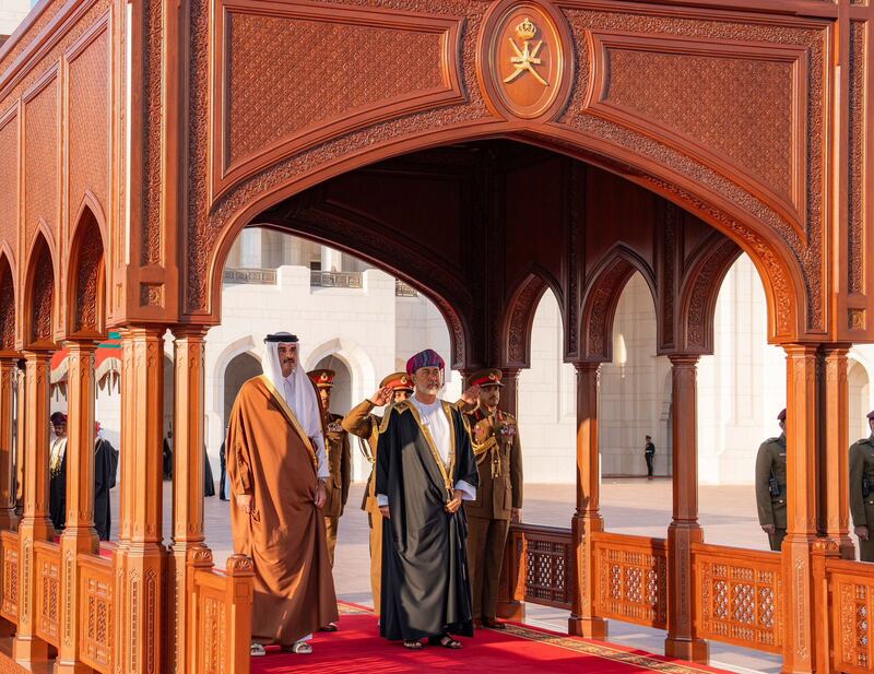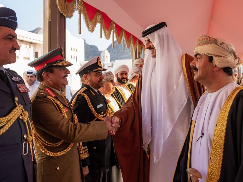 بعدها اصطحب جلالةُ السُّلطان المعظم صاحبَ السُّموّ الأمير إلى منصّة الشّرف، حيث عُزف السّلام الوطنيُّ لدولة قطر الشقيقة.