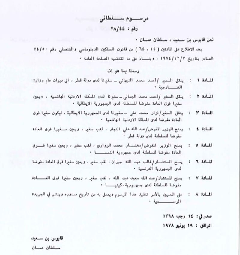 وظل النبهاني سفيرًا لسلطنة عمان لدى قطر حتى 19 يونيو 1978 عندما صدر المرسوم السلطاني السامي رقم (44/78) الذي نص في مادته الأولى على أن ينقل السفير أحمد محمد النبهاني إلى ديوان عام وزارة الخارجية، وحل محله الوزير المفوض عبدالله علي النجار الذي منح لقب سفير، وعين سفيرًا فوق العادة مفوضا للسلطنة لدى دولة قطر.