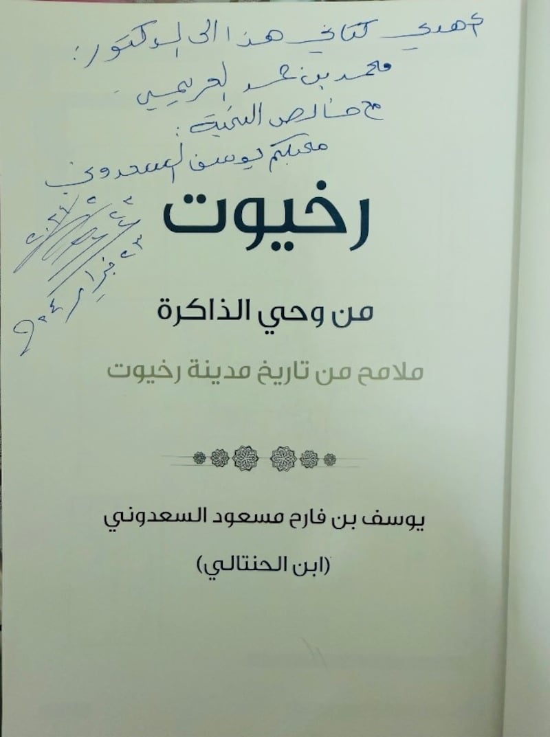 ولد الباحث يوسف بن فارح مسعود السعدوني (ابن الحنتالي) في مدينة رخيوت في عام 1953م، وهو عضو في عدد من اللجان المحلية في الولاية. كما أشرف على مشاركات ولاية رخيوت في عدد من المناسبات والفعاليات، وله إسهامات في مجال الشعر النبطي والشعر الغنائي، وهو عضو الاتحاد الدولي للأدباء والشعراء العرب، ومؤسس فرقة رخيوت الأهلية للفنون عام 2012.