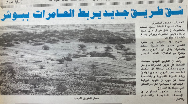 وفي منتصف مارس من عام 1995م، أي قبل ثلاثين عامًا من الآن، بدأت المديرية العامة لبلدية مسقط بالعامرات في شق طريقٍ جبلي يربط ولاية العامرات بولاية بوشر ويبلغ طوله 12 كيلو مترا وذلك لتخفيف الضغط على طريق العامرات-وادي عدي، ولاختصار المسافة بين الولايتين إلى النصف، عدا عن إسهاماته في زيادة الحركة التجارية والاقتصادية، ودوره في تقوية الروابط الاجتماعية لا سيما بين القرى والمناطق التي سيخدمها المشروع.