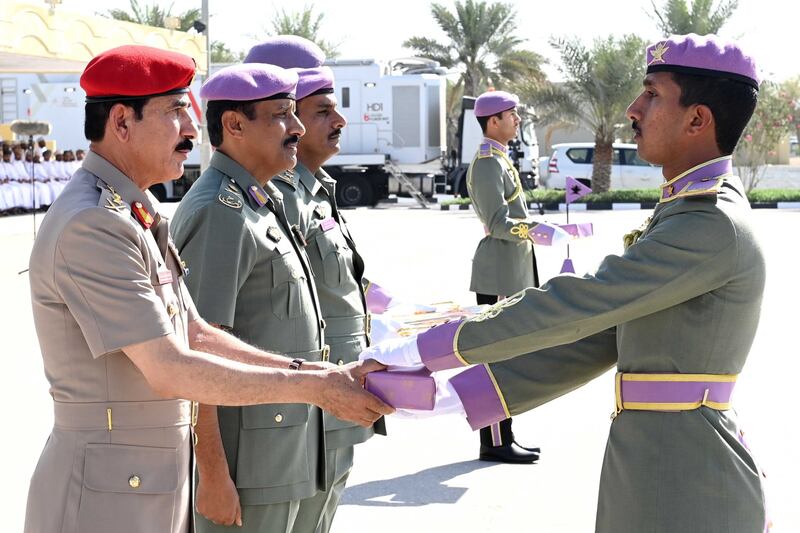 ولَدَى وصول معالي الفريق أول وزير المكتب السُّلطاني راعي الحفل ميدان الاستعراض العسكري بمعسكر الصمود عزفت موسيقى الحرس السُّلطاني العُماني السلام السُّلطاني، وأدَّى طابور الخريجين التحية العسكرية لمَعَاليه، ثم قام معالي الفريق أول وزير المكتب السُّلطاني بتفتيش الصف الأمامي من طابور الاستعراض، عقب ذلك قدم الخريجون عرضا عسكريًّا بالمسير البطيء مروراً من أمام المنصة الرئيسة لميدان الاحتفال مؤدين التحية العسكرية لمعالي راعي الحفل، ثمَّ قام مَعَالي الفريق أول بتسليم الجوائز لأوائل الدفعة المتخرجة، بعد ذلك أدت الدفعة المتخرجة قسم الولاء وهتفوا ثلاثاً بحياة مولانا حضرةِ صاحبِ الجلالةِ السُّلطان هيثم بن طارق المعظم القائد الأعلى -حفظهُ اللهُ ورعاهُ-.