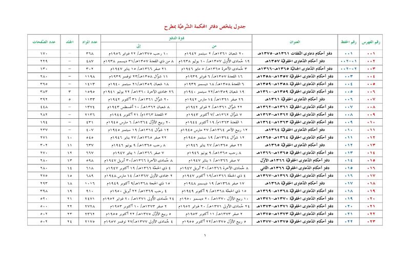 في هذا المبحث عرض الباحث الشيخ بدر الراجحي لجداول تلخّص دفاتر المحكمة الشرعية بمطرح، حيث استعرض (62) دفترًا شرعيًا من حيث: رقم الفهرس، ورقم الحفظ، والعنوان، وفترة الدفتر، وعدد المواد، وعدد الصفحات.