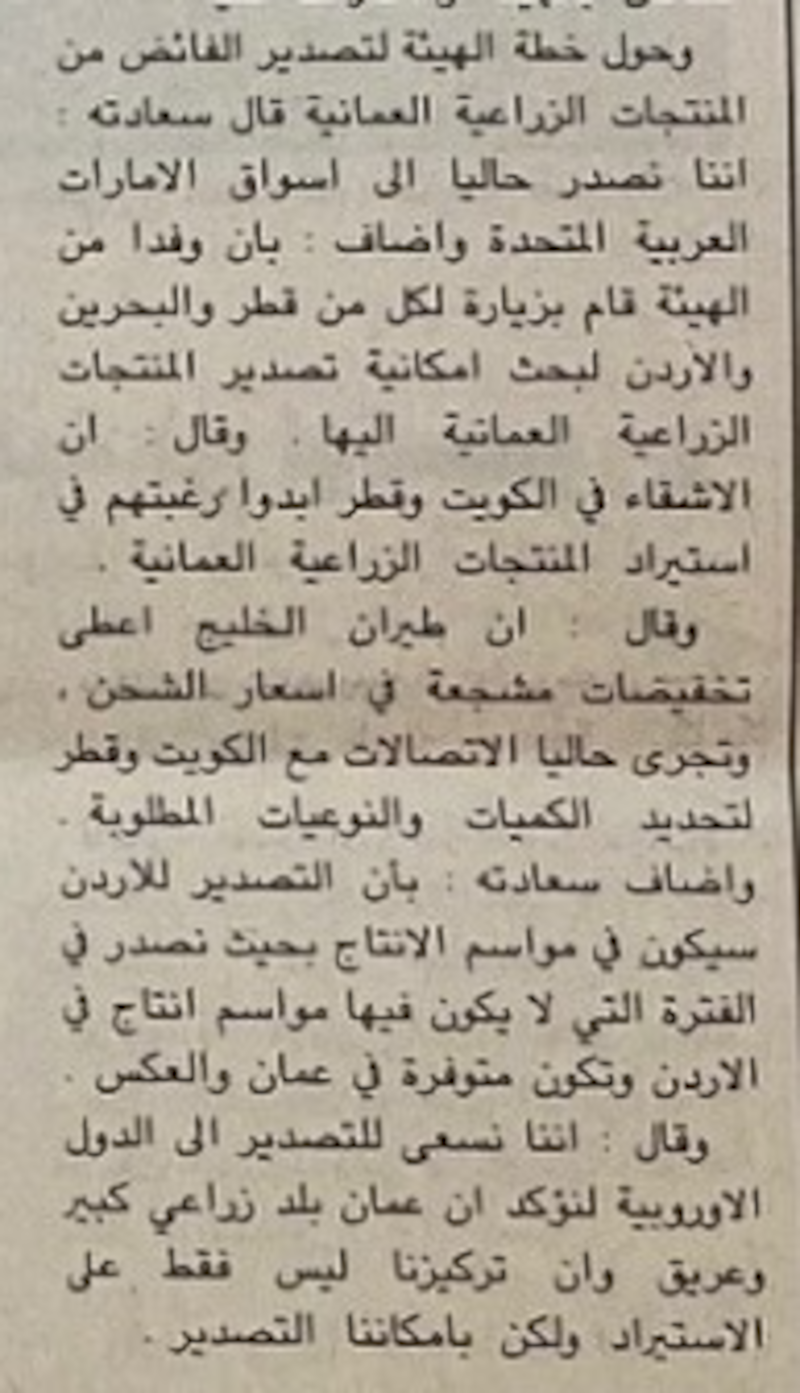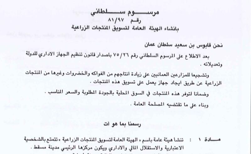 ولهذا السبب فقد صدر المرسوم السلطاني رقم (97/81) بإنشاء الهيئة العامة لتسويق المنتجات الزراعية.
