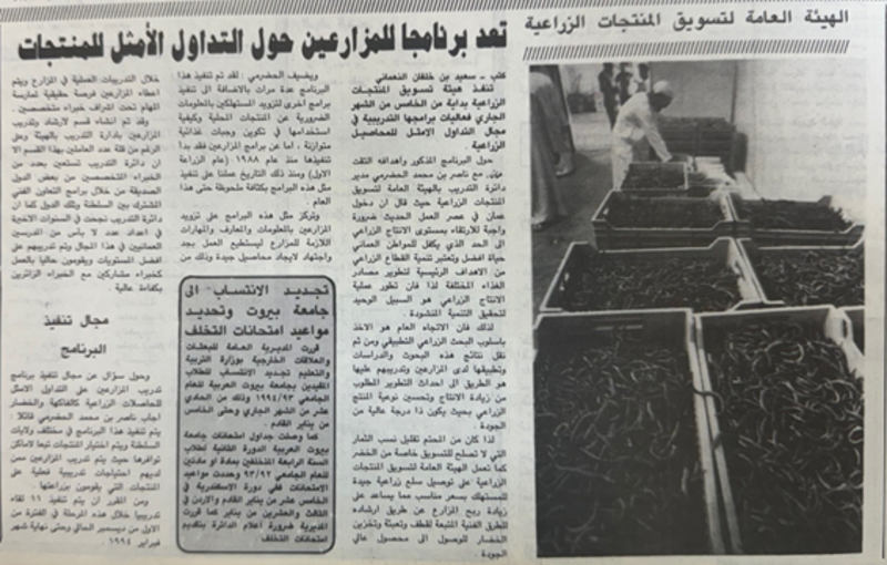 عملت الهيئة العامة لتسويق المنتجات الزراعية على تدريب وإرشاد المزارع العماني عن كيفية جني محصوله، وكذلك اتباع أفضل الوسائل لتسويقه من خلال تدريبه على الأساليب الزراعية لما بعد الحصاد مثل الفرز والتدريج والتعبئة واتباع الأساليب الصحية للنقل حتى لا يتلف المحصول أثناء هذه العمليات؛ ما يقلل من قيمته التسويقية، في جهود من الهيئة لمساعدة المزارع على زيادة دخله، بالإضافة إلى تدريب العناصر النسائية على عمليات التصنيع والتخليل والتقليل من التالف في المنتجات الزراعية.