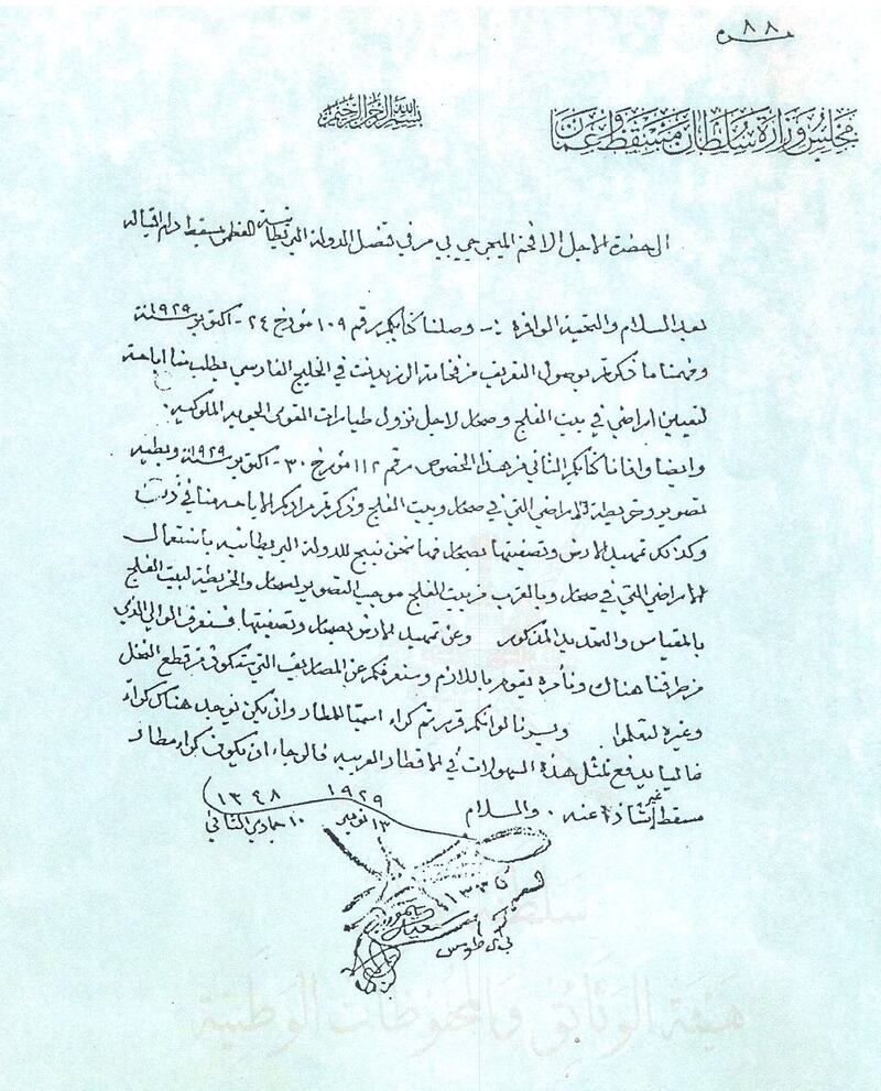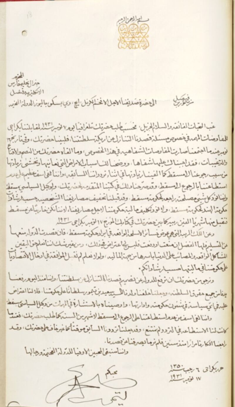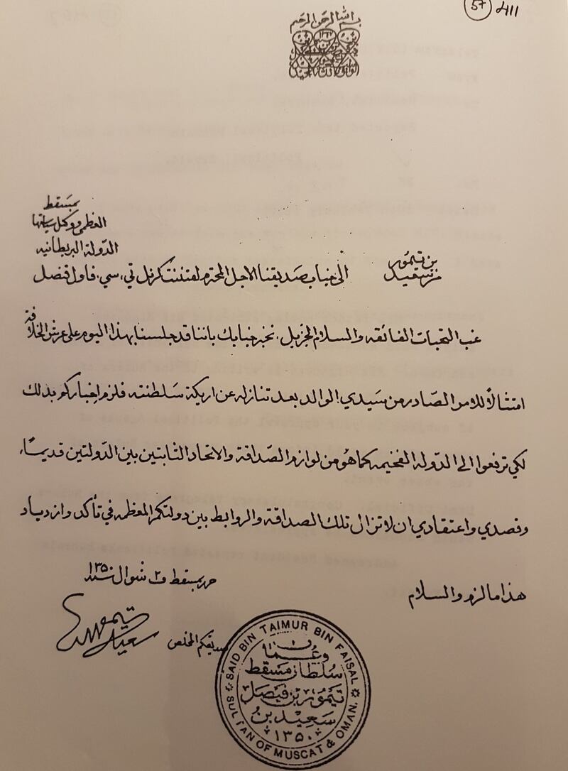 وكان السلطان تيمور بن فيصل قد أرسل خطاب التنازل الأخير إلى المقيم البريطاني في الخليج في 17 نوفمبر 1931م وفيه أوضح أن تنازله عن الحكم سيكون لابنه سعيد، وجاء في الخطاب: " ونرجو من حضرتك أن ترفع للدولة عن تصميم قصدنا التنازل عن سلطنتنا، وإننا منذ اليوم رفعنا يدنا عن جميع حقوق السلطنة، وجعلنا خلَفنا ولدنا السيد سعيد بن تيمور سلطانًا على حكومتنا، فليس لنا اعتراض عليه في أي سياسة في شؤون حكومته وإدارتها، وأوصيناه باستشارة الوكيل السياسي في مسقط في المهام الصعبة“.