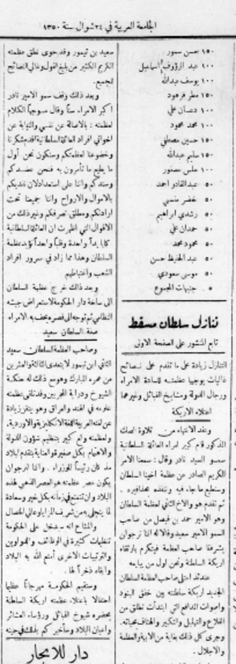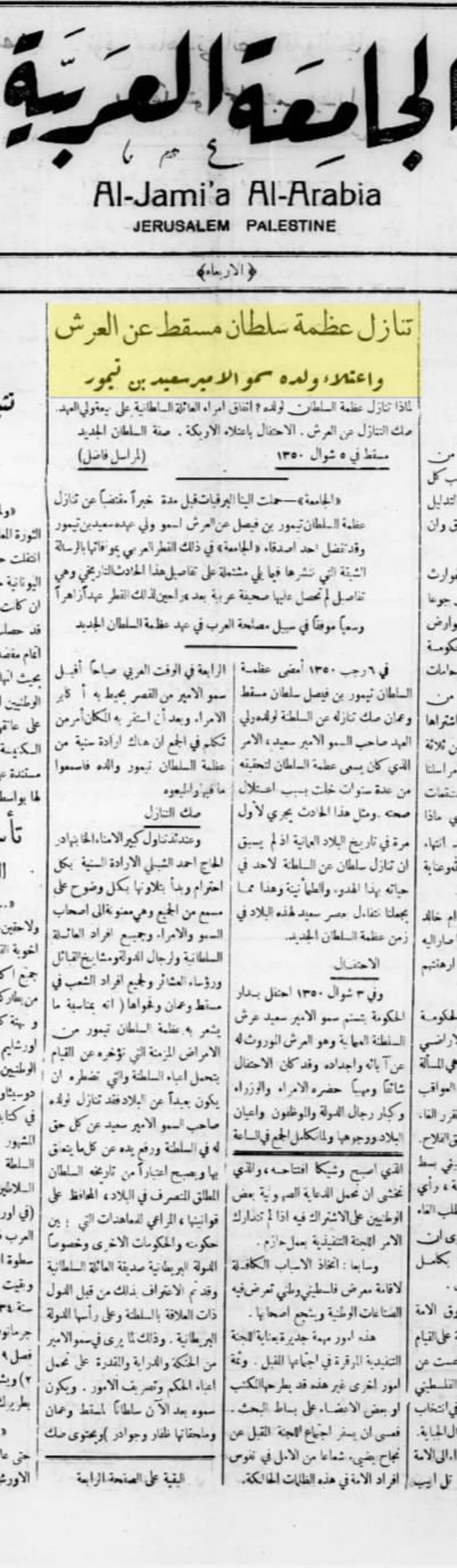 في مثل هذا اليوم من شهر شوال عام 1350هـ، أي قبل 96 عامًا تنازل السلطان تيمور بن فيصل عن مقاليد الحكم في السلطنة لابنه السلطان سعيد بن تيمور بعد حوالي 19 عامًا قضاها على عرش سلطنة عمان، وبعد محاولات عديدة للتنازل بدأت منذ حوالي 13 عامًا من تنازله الفعليّ في 1932م.