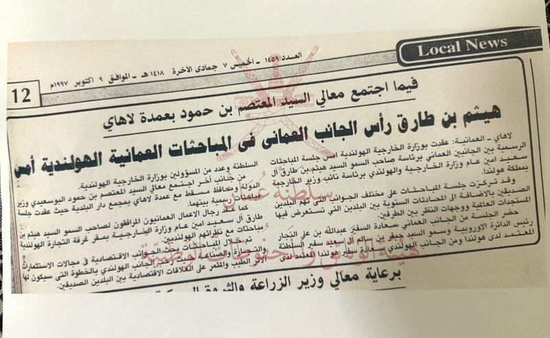 ”أثير“ تعرض خبرًا عن زيارة كان قد قام بها صاحب الجلالة -حفظه الله- قبل حوالي (28) عامًا وتحديدًا في أكتوبر من عام 1997م وكان وقتها يشغل منصب أمين عام وزارة الخارجية، وخلال تلك الزيارة ترأس جلالته الجانب العماني في جلسة المباحثات الرسمية مع الجانب الهولندي والتي تركزت على مختلف الجوانب التي تهم البلدين الصديقين بالإضافة إلى المحادثات السنوية بين البلدين التي تُستعرض فيها المستجدات العالمية ووجهات النظر بين الطرفين.