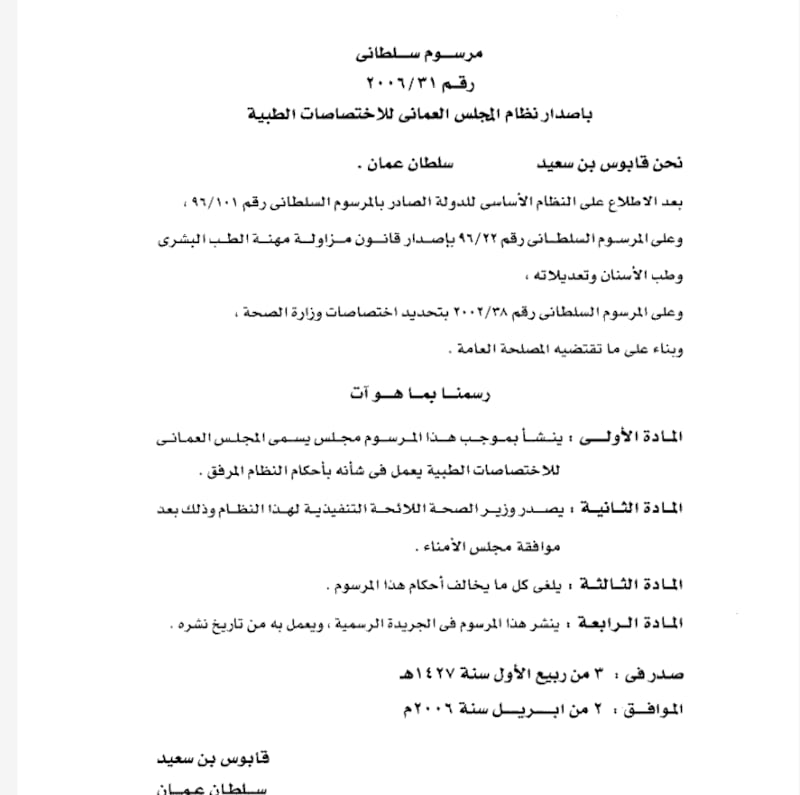 تم في الثاني من أبريل 2006م إصدار نظام المجلس العماني للاختصاصات الطبية وفق المرسوم السلطاني رقم ٣١ / ٢٠٠٦