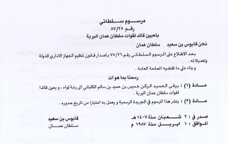 في هذا اليوم صدر المرسوم السلطاني رقم ٢٥ / ٨٧ بتعيين قائد لقوات سلطان عمان البرية، حيث نص المرسوم على ترقية العميد الركن خميس بن حميد بن سالم الكلباني إلى رتبة لواء وتعيينه قائدًا لقوات سلطان عمان البرية.