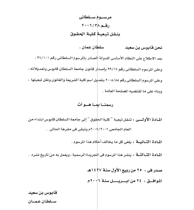 صدر المرسوم السلطاني رقم ٣٨ / ٢٠٠٦ بنقل تبعية كلية الحقوق إلى جامعة السلطان قابوس ابتداءً من العام الدراسي 2006/2007م، مع بقائها في مقرها الحالي.