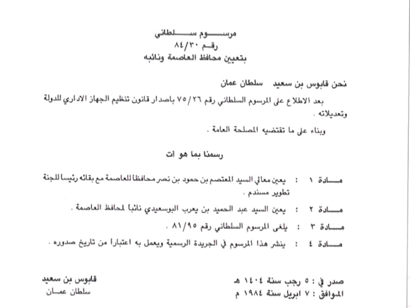 كما صدر في اليوم ذاته المرسوم السلطاني رقم ٣٠ / ٨٤ بتعيين محافظ العاصمة ونائبه، والذي قضى بتعيين معالي السيد المعتصم بن حمود بن نصر محافظًا للعاصمة مع بقائه رئيسًا للجنة تطوير مسندم، وتعيين السيد عبد الحميد بن يعرب البوسعيدي نائبًا لمحافظ العاصمة.