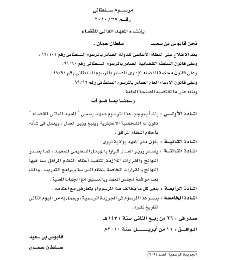 في هذا التاريخ صدر المرسوم السلطاني رقم ٣٥ / ٢٠١٠ بإنشاء المعهد العالي للقضاء، ونص المرسوم على أن ينشأ معهد يسمى “المعهد العالي للقضاء” تكون له شخصيته الاعتبارية ويتبع وزير العدل، ويكون مقره بولاية نزوى.