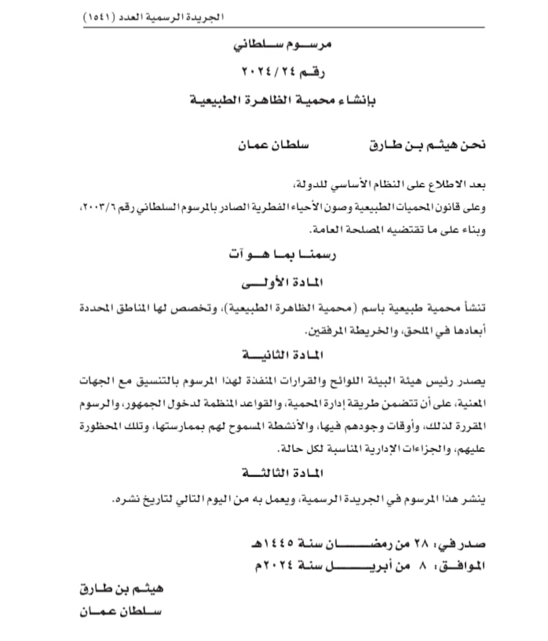 صدور المراسيم السلطانية رقم 23/2024، ٢٤ / ٢٠٢٤، 25/2024، بإنشاء محمية الجبل الغربي الطبيعية، ومحمية الظاهرة الطبيعية، ومحمية واحة البريمي الطبيعية.