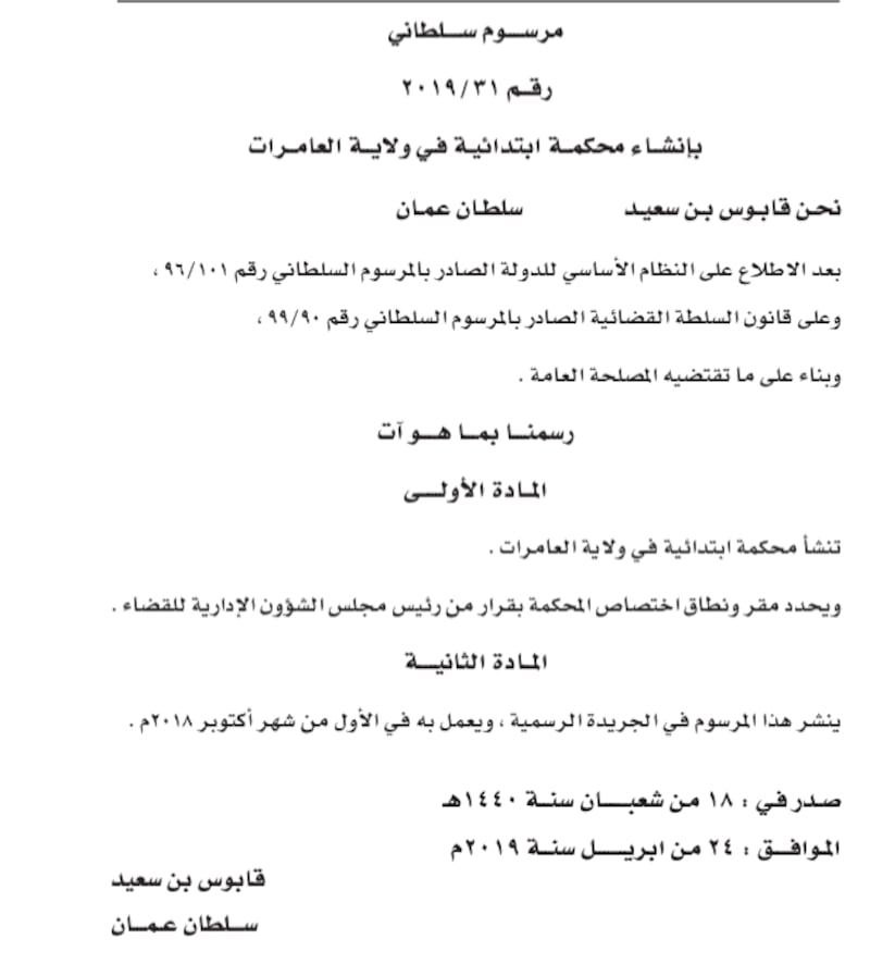 في الرابع والعشرين من أبريل 2019م صدر المرسوم السلطاني رقم ٣١ / ٢٠١٩ بإنشاء محكمة ابتدائية في ولاية العامرات.